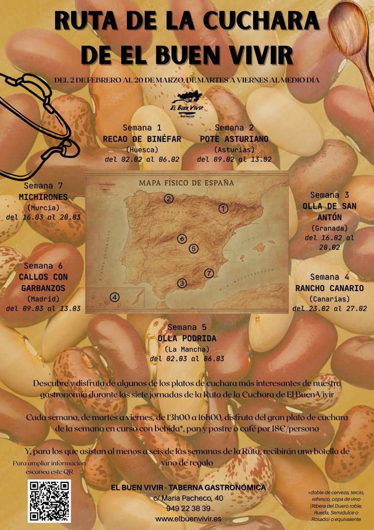Al igual que el año pasado la Ruta de la Cuchara de El Buen Vivir tendrá una duración de siete semanas, comenzando el dos de febrero y finalizando el 20 de marzo, una fecha que se nos antoja muy adecuada ya que ese último día despediremos Ruta y estación, con la conciencia tranquila y los estómagos llenos para afrontar la inminente primavera.